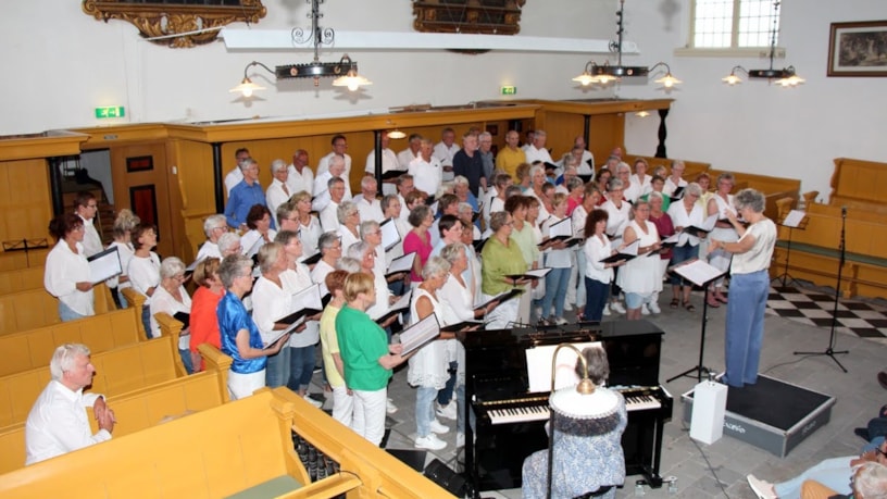 Net als in juli 2024 (zie de foto) geven we een zomerconcert met Koor sWing uit Heiloo, maar nu in de Witte Kerk van Heiloo. Onze dirigent Caroline Offerhaus is dirigent van beide koren.
