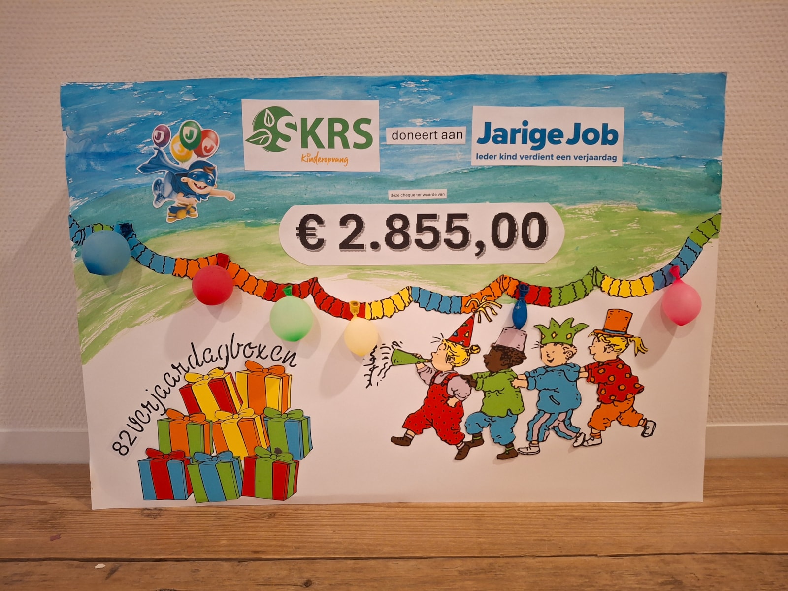Vorige week hebben we samen met een paar enthousiaste kinderen op feestelijke wijze de cheque overhandigd aan ambassadeur Jacqueline van Stichting Jarige Job. De donatie staat gelijk aan 82 verjaardagspakketten, gevuld met slingers, traktaties en cadeautjes, waarmee 82 kinderen kunnen rekenen op een onvergetelijke verjaardag.
