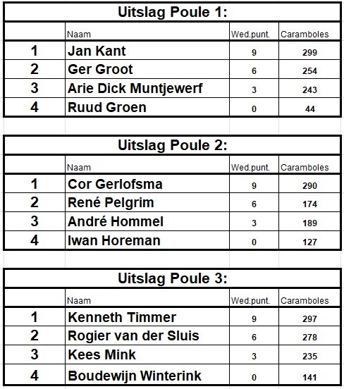 Nadat de 12 deelnemers verdeeld over drie poules tegen elkaar hadden gespeeld kwamen Jan Kant, Cor Gerlofsma en Kenneth Timmer als poulewinnaars uit de vele spannende partijen.