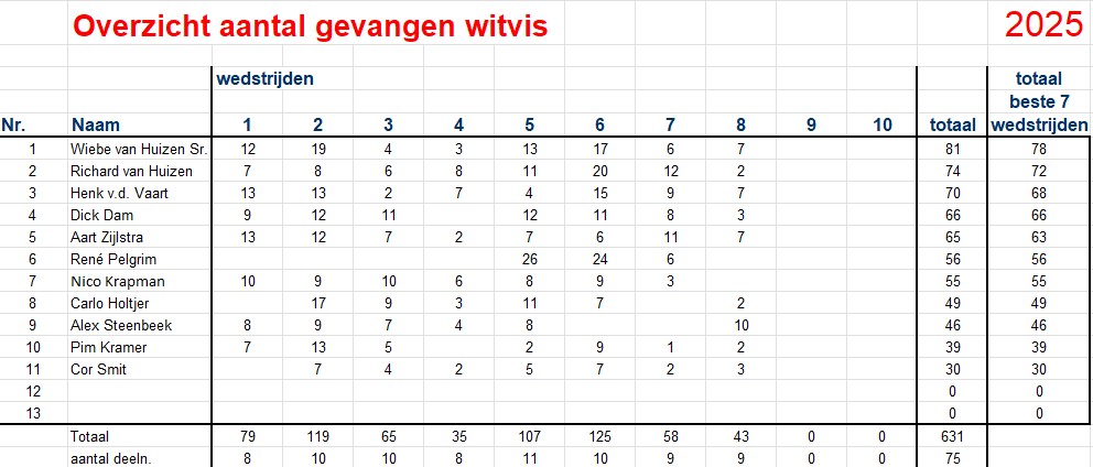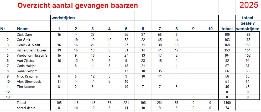 Dick Dam gaat nog steeds aan de leiding met een totaal van 189 baarzen, tweede staat Cor Smit met 163 en derde Henk van der Vaart met 159.