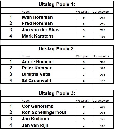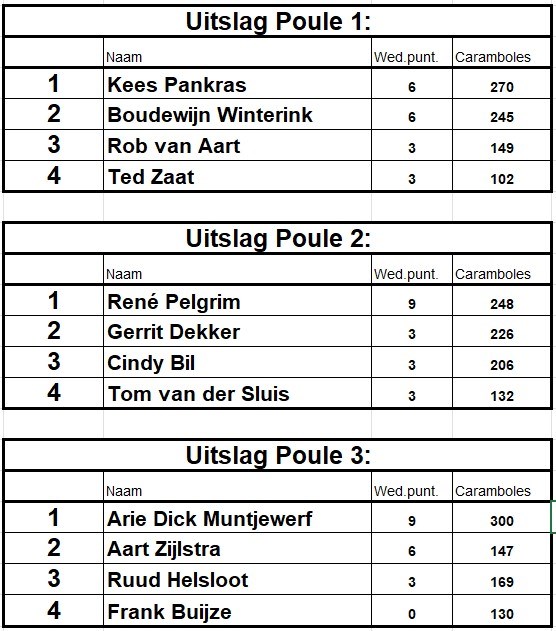 De toernooiorganisatie heeft de loting voor de dag-en poule-indeling verricht. In de bijlage vind je de dagindeling, om de spanning extra op te voeren wordt de poule-indeling op de speelavonden bekend gemaakt.